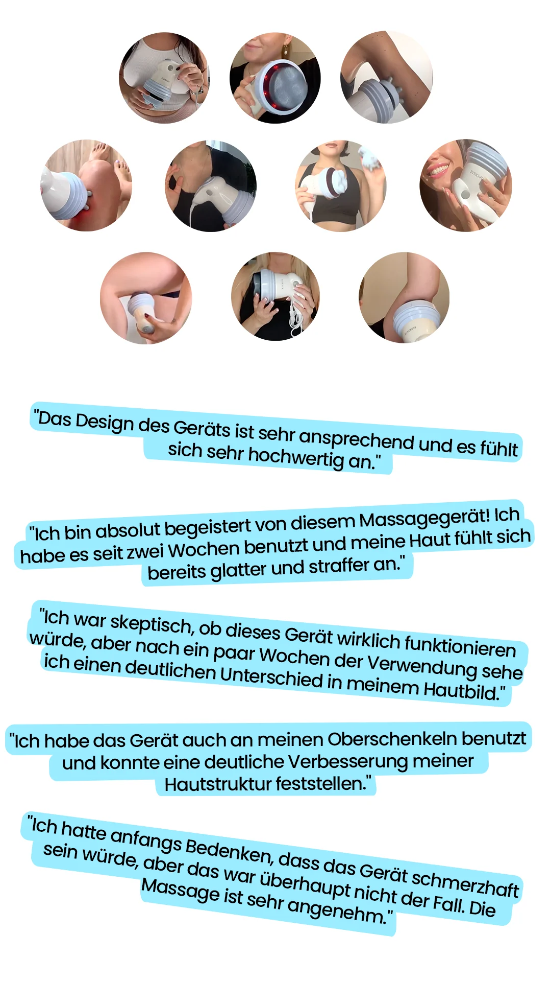 - Durchblutungsförderung: Das Gerät steigert die Durchblutung, um Toxine abzubauen und die Nährstoffversorgung der Haut zu verbessern.