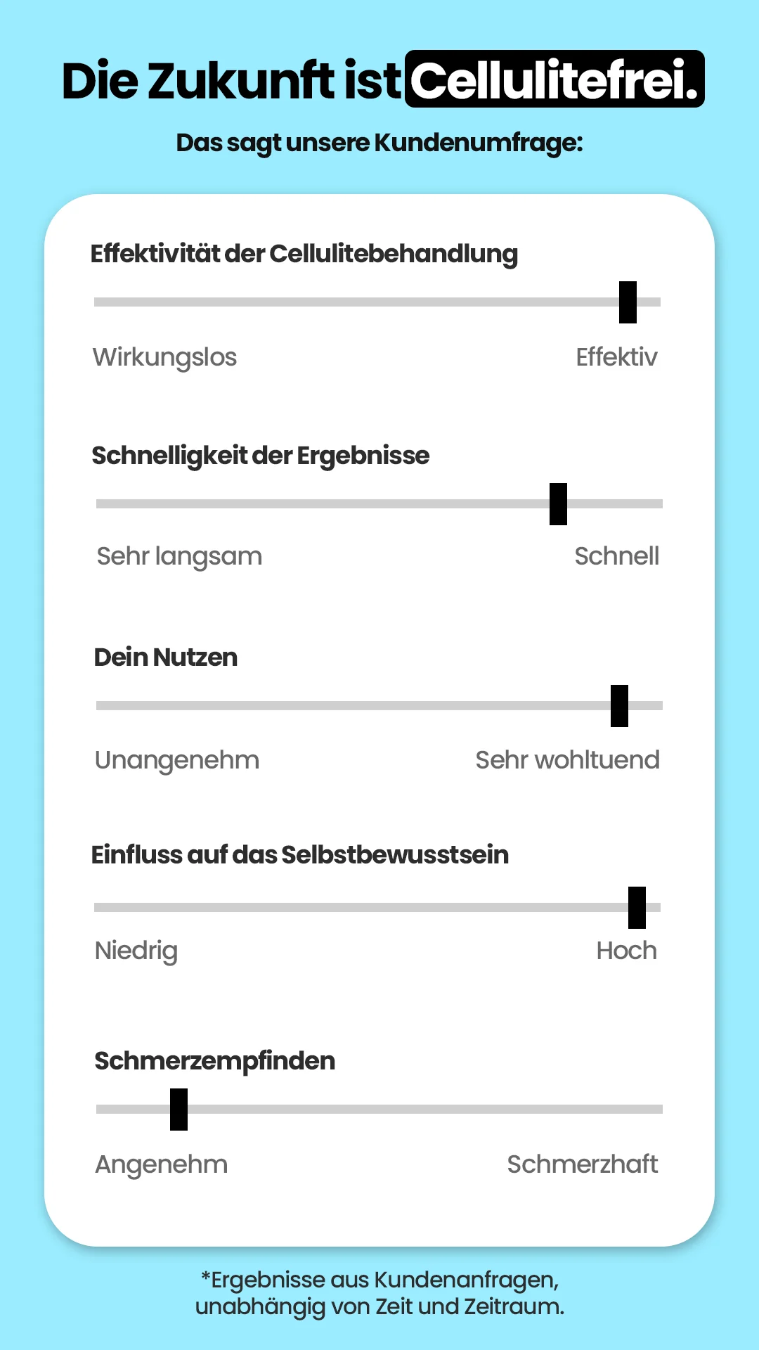 In Anwendungsstudien konnte nachgewiesen werden, dass sich das Hautbild kontinuierlich verbessert.In 12 Wochen nahm die Elastizität im Durchschnitt um bis zu 53% zu, und die Fettzellen wurden um bis zu 58% reduziert. Mit diesem dualen Wirkmechanismus auf Kollagenfasern und Fettzellen werden die Ursachen von Cellulite gezielt und nachhaltig angegangen.